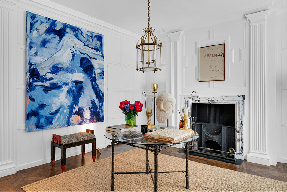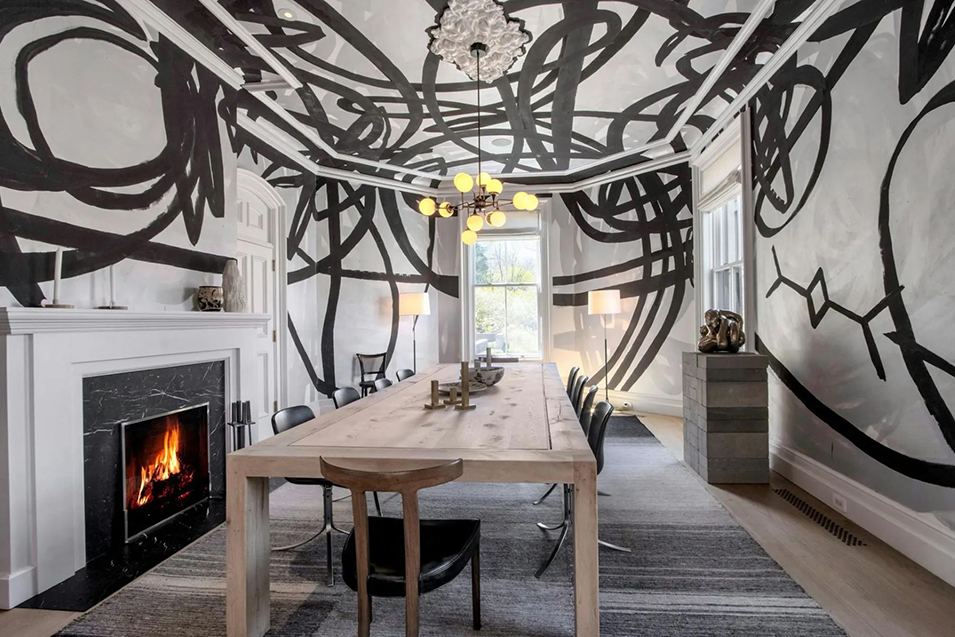 Elsewhere at Niederhurst—a Gilded Age-era estate perched above the Hudson River in Snedens Landing, New York—surrealist elements are subtly threaded throughout the eclectic residence. The property has been thoughtfully restored and reimagined by its current owner Sara Story, a Manhattan-based interior designer with a penchant for “sophisticated, timeless spaces with an air of whimsy.” The dining room is an immersive artwork in itself, with a bold black-and-white mural by Austrian artist Otto Zitko envisioned especially for the space.