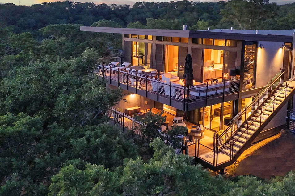 The heart of the home is an open living, dining, and kitchen space clad almost entirely in wide-plank European oak and stone that create a warm, earthy ambience, only furthered by a fireplace and a set of windows offering a leafy outlook. The cook’s and entertainer’s kitchen features a glass-walled wine “gallery,” stainless-steel appliances, and a marble-topped island with counter seating. The light-filled bedrooms enjoy views of blue skies, the enveloping greenery, the coastal mountains that bound the Dry Creek Valley, and sunsets in the distance. The primary suite—located on the main level—includes a luxurious bath with a sculptural soaking tub and an outdoor shower. A second, similarly lavish suite and two guest bedrooms—all opening to terraces—occupy the lower level. A strikingly artful stairway of wood and iron links the two floors.