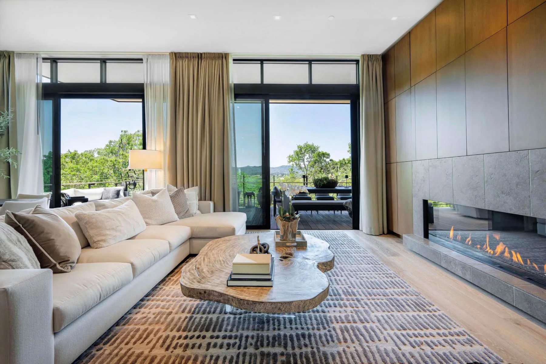 Some three miles from the town’s historic downtown plaza is the prestigious residential and resort community of Montage, which occupies 258 acres of gently rolling terrain and wooded hills interspersed with vineyards tended by celebrated winemaker Jesse Katz. Nestled on a hillside amid leafy treetops, this private four-bedroom home presents a contemporary alternative to the historic charm of the town, with sleek, stylish modern spaces representing a new paradigm of wine country living. Intended as a sophisticated turnkey retreat, it is being offered with custom-selected furnishings and a curated art collection.