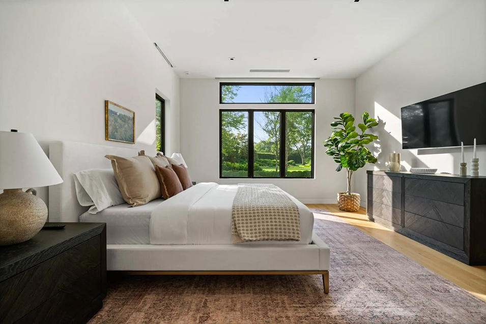 Throughout the main level, expanses of glass turn scenery into dynamic art and admit floods of glorious natural light. Lofty ceilings conjure a sense of airiness and volume, while wide-plank blonde hardwood floors provide a grounding, organic quality. Living and dining rooms accommodate festive gatherings in style. The kitchen will please the entertainer and cooks of all skill levels with its outsize island, counter seating, abundant cabinetry, superior-caliber appliances, and sunny breakfast area and family room. The busy professional will appreciate the handsome, contemplative office. In one of the home’s relaxed lounges, a disappearing wall of glass opens to a terrace and the grounds. Other highlights include a state-of-the-art media room and—on the lower level—a gym and a variety of versatile auxiliary spaces.