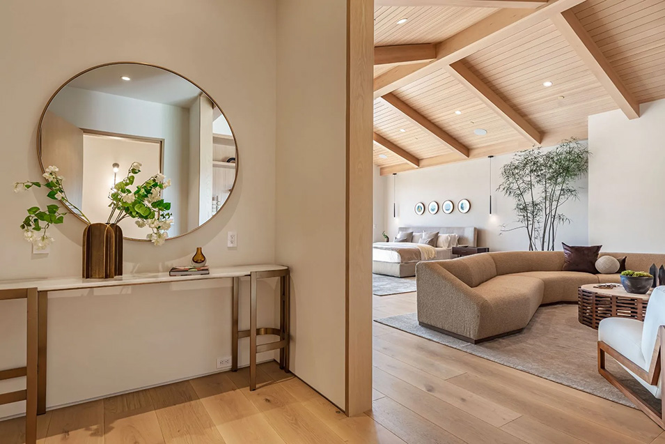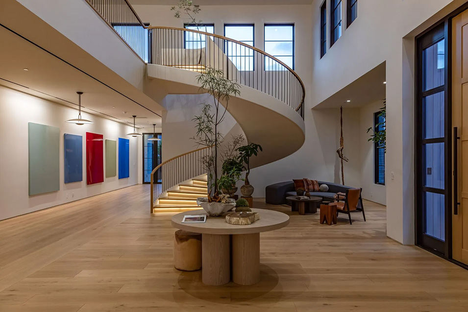 Sited on just over two acres on a coveted cul-de-sac in Hidden Hills, this meticulously constructed new 16,112-square-foot residence is transporting, recalling both a rustic but refined California spa getaway and—with its emerald lawn and that quintessential fencing in view—a timeless equestrian estate. Altogether, the home and its guesthouse offer eight bedrooms, 11 baths, and an inviting open floor plan with an airy, loft-like ambience and an effortless flow. Numerous pitched rooflines, soaring ceilings, and towering windows create an impressive sense of volume filled with floods of light, while carefully chosen building materials in soothing organic hues pay homage to the natural surroundings.