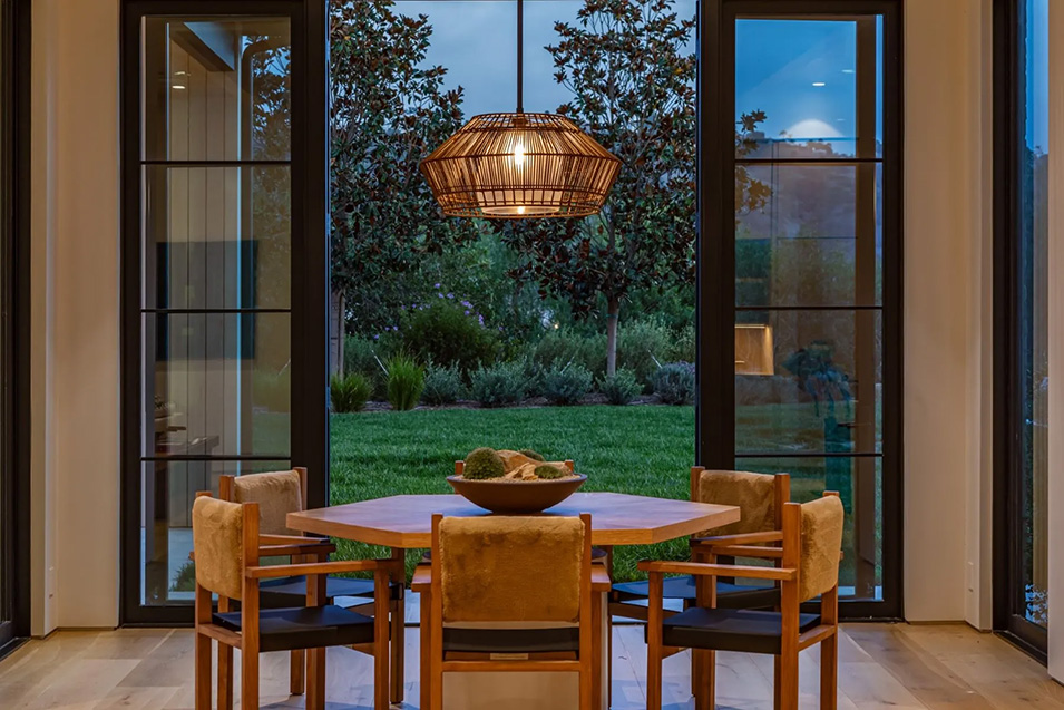 Across the ample motor court, which leads to generous garaging for seven cars, the guesthouse offers an open living area and kitchen with counter seating and an artful collection of windows. Beyond the verdant grounds and the community’s prestigious gated bounds are the rolling expanses of the Upper Las Virgenes Canyon Open Space Preserve and the gardens and museum of the Leonis Adobe National Historic Landmark—both uncommon attractions that further the sense of bucolic escape here, on the outskirts of one of the world’s most bustling cities.