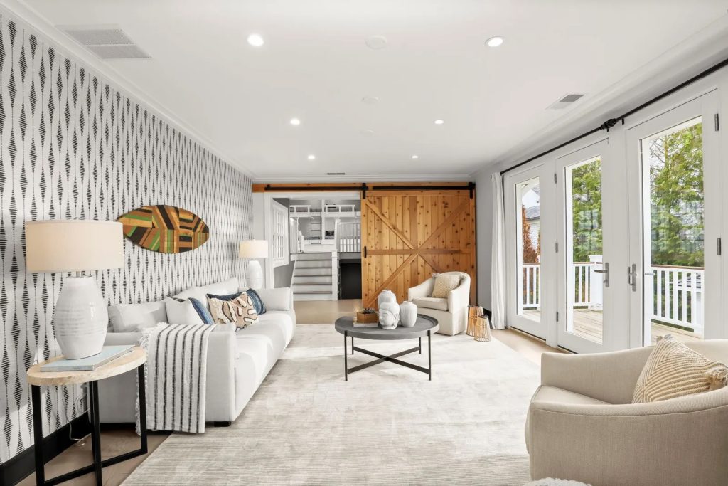 Secluded on the other side of an extensive butler’s pantry—which includes built-in storage and a convenient powder room—are a casual, inviting family room with an expanse of glass that admits floods of light, offers views of the water and horizon, and opens to the deck; a well-outfitted mudroom; and a light-filled office or gym that allows for at-home fitness or business pursuits. Behind a rolling barn door in the family room, a set of stairs in a windowed breezeway leads to a generous skylit “bonus” room that includes six bunk beds, play space, a living area, a stylish bath with a walk-in shower, and a kitchenette with ample storage and a beverage refrigerator. Below the bunkroom on the lowest level is an enviable three-car garage, also easily accessed from the breezeway.