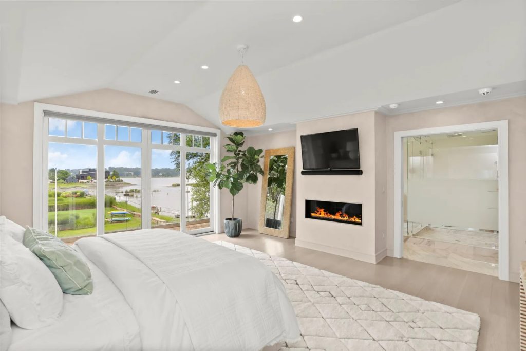 The bedrooms are peacefully sequestered on the uppermost level. Each of the three guest bedrooms is a restful retreat with its own water view and en suite bath. The owner’s suite benefits from a wide waterfront view, a gas fireplace, a room-sized walk-in closet and dressing area, and a spa-inspired bath with dual vanities, a discreet water closet, an eye-catching modern soaking tub, and a shower. The bedroom opens to its own terrace, where a clear railing ensures that the idyllic view remains uninterrupted.