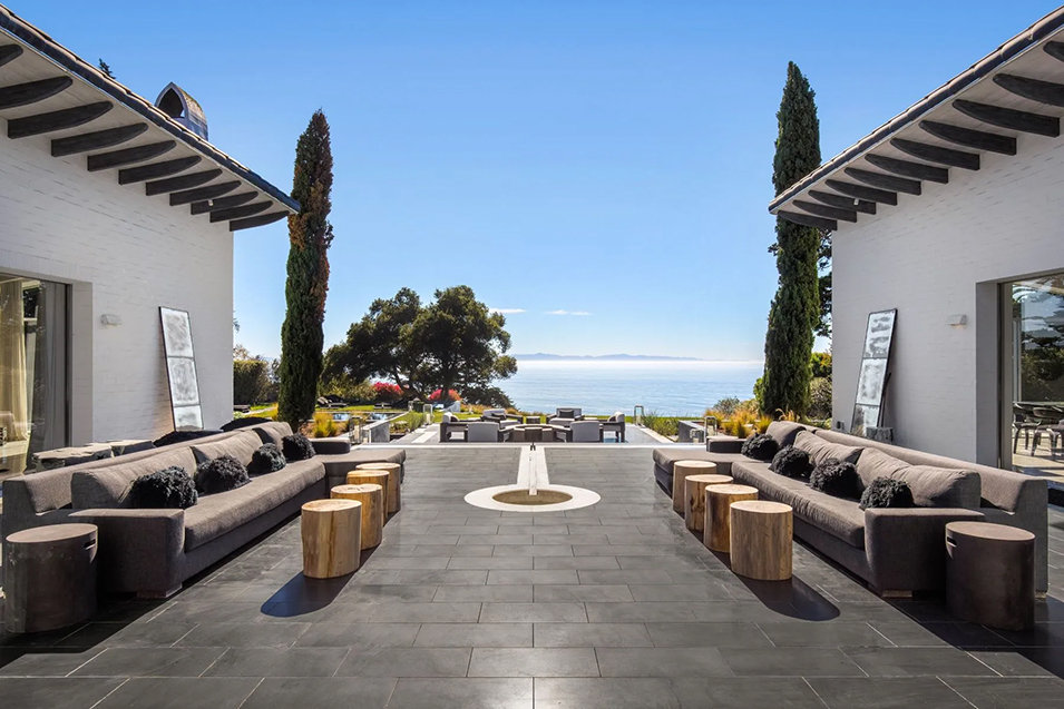 The focus inevitably turns to the dazzling saltwater swimming pool, with its deep cerulean waters echoing the neighboring sea. Its companion is a lounging terrace designed for basking in the warm, prevailing sun or nighttime stargazing beside a second fire feature. In an outlook worthy of any postcard, a swath of emerald lawn unfurls toward a stalwart mature oak and the cliff’s edge, where an enviable observation deck offers an unparalleled view of the heart and soul of Southern California: azure waves crashing on serene sandy beaches, with rosy sunsets serving as a fittingly dramatic backdrop.