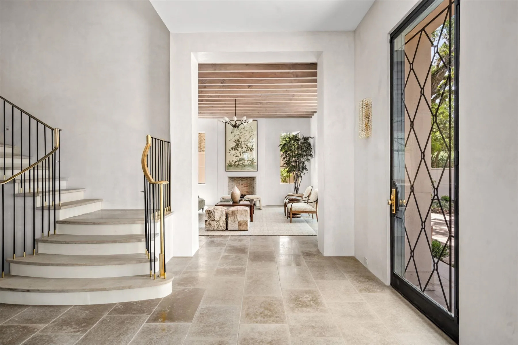 A bright, inviting foyer introduces the home’s characteristic floods of sunlight—filtered by the enveloping leafy oaks—airy volume, and plaster walls ideal for displaying art. Adjoining are a living room with limestone floors, wood ceiling beams, and an Isokern masonry fireplace as well as a spacious formal dining room with a beamed ceiling and windows on two sides. Facilitating festive entertaining is a nearby wet bar with a marble counter, handsome woodwork, and abundant storage. Vast and versatile, the cook’s kitchen features an island with counter seating, vintage pendant lighting, a 72-inch Sub-Zero refrigerator, dual Bosch dishwashers, and a five-burner Lacanche range with two ovens, a warming drawer, and a discreet remote-controllable hood. Flowing effortlessly from the kitchen is a great room with a custom steel and retractable glass wall giving way to the lush backyard and a two-sided fireplace shared with the adjoining lounge and bar with a full-size wine chiller. Tucked into a cozy corner is a morning room—which could easily serve as a den or office—embraced by large windows.