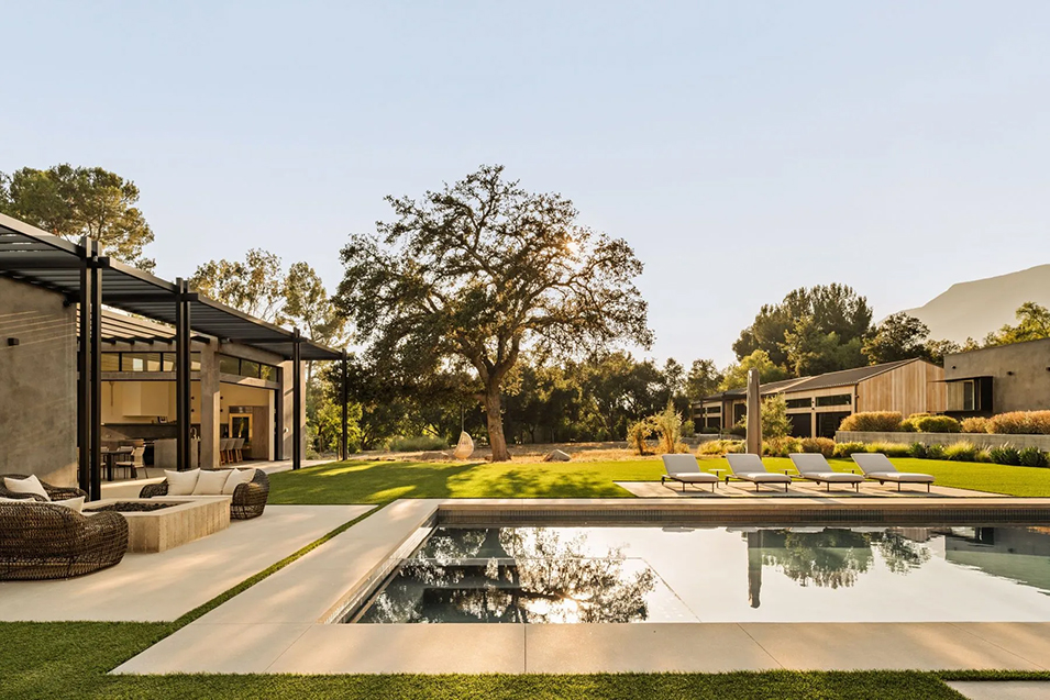 On 2.2 acres in the scenic Ojai Valley, this singular 11,391-square-foot estate consists of multiple chic pavilions linked by patios and gardens and centered around a resort-caliber swimming pool and spa.