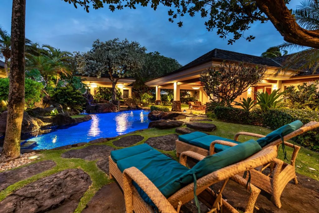Kai Moena, “The House of the Resting Sea,” offers oceanfront luxury on Kailua’s world-famous beachfront. Spanning nearly 60,000 square feet across two parcels, this estate features over 255 linear feet of pristine white sandy beach, providing a serene and private setting. The property includes two main residences with a total of 10 bedrooms. Rich tropical hardwood accents, high vaulted ceilings, and seamless indoor-outdoor living spaces define the residences. Exceptional amenities include a resort-style lagoon pool with waterfalls, a fitness center, massage room, media room, dry sauna, and tennis/pickleball court. Lush landscaping completes this private sanctuary.