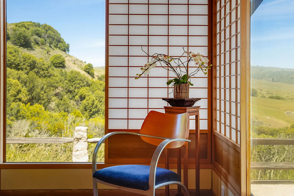 West Wind Estate, comprising two homes set in a landscape of gardens, koi ponds and a vineyard, shows the international influence of Japanese minimalism at play in California. The property blends references to traditional Japanese architecture, such as shoji screens, with touches of contemporary comfort. It is described as “American sukiya,” referring to the Japanese architectural style that emphasizes natural materials, simplicity, and a connection between indoor and outdoor spaces.