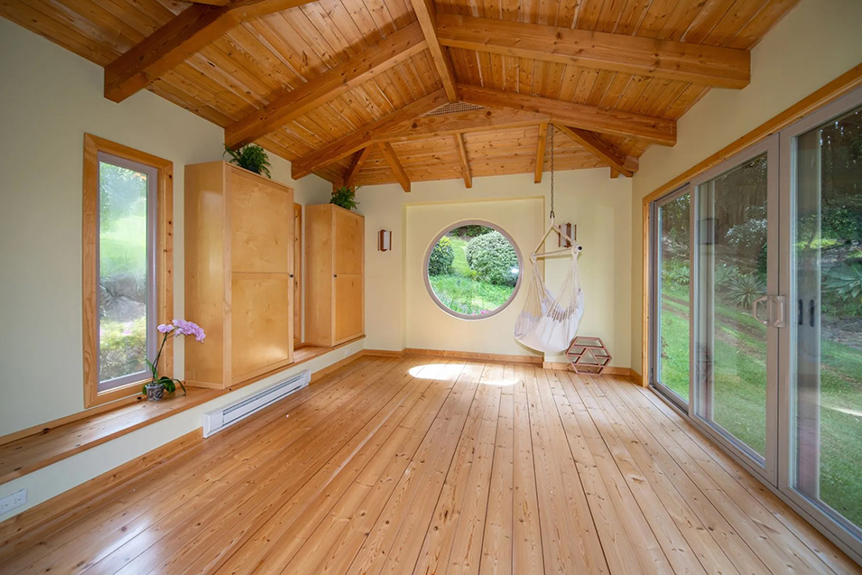 A peaceful estate in Kula, Hawaii takes an indoors-outdoors approach to this sanctuary mindset. The main residence houses a sauna and spa, while a swimming pool and freestanding yoga pavilion are nestled into its tropical landscaping. Set within five acres overlooking Maui’s Upcountry and the Pacific Ocean, the pavilion is surrounded by manicured, zen-style gardens designed for reflection and retreat.